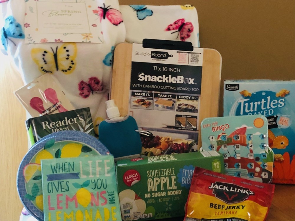 The Road Trip themed "basket" contains the following: Farberware SnackleBox with Bamboo Cutting Board Top Butterfly-themed blanket Road Trip Bingo Cards (2) Plates and napkins (16 each) Beef Jerky Apple Juice boxes (12) Turtle-shaped cheese snack crackers Water Bottle Readers' Digest book (4 novels) Weighted Bookmar