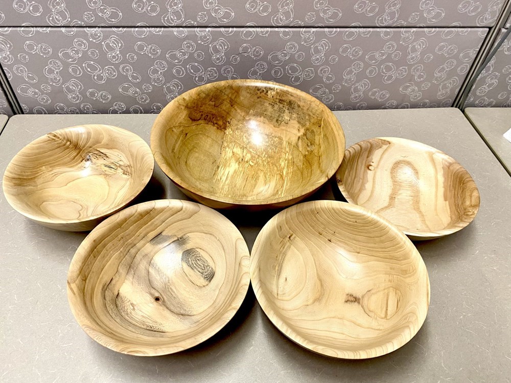 5 Lathed Wooden Bowls 1 Large Maple Wooden Bowls 4 inches deep. Diameter 11 1/2 Inches 4 Maple Bows approximately 2 inches deep. Diameter 8-9 inche Donated by Dick & Donna Martin out of Rogers MN 4 Nesting Bowls Hand Lathed Bowls