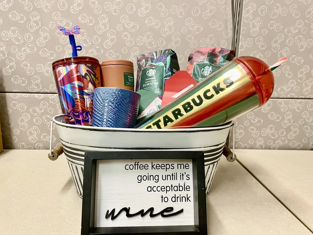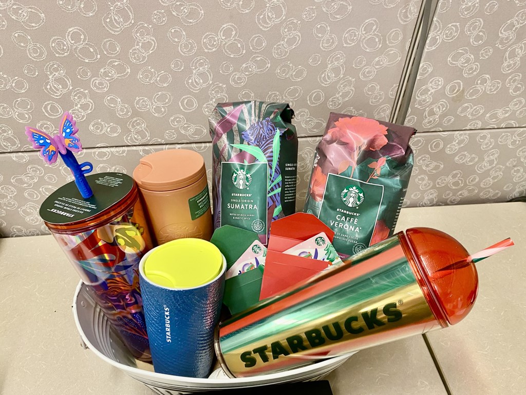 Enjoy the delight of Starbucks Coffee to keep you going. 16 oz Bag of whole bean Sumatara coffe 16 oz Bag of whole bean Cafe Verona 4 Travel Mugs and $40.00 Starbucks Gift Card