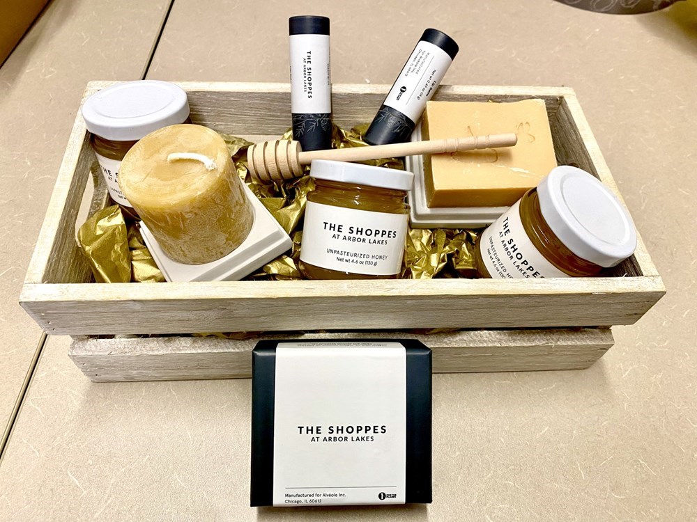 The Shoppes at Arbor Lakes and their happy bees! 3, 4.6 oz jars of unpasteurized Honey 1 Beeswax Candle 1 Beeswax Bar of Soap (adorable) 2 Beeswax lip balms 1 Honey Dipper Stick