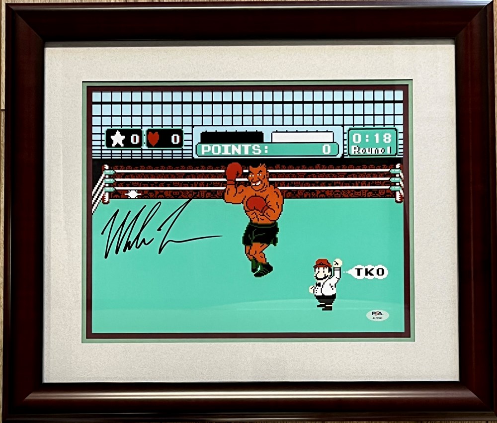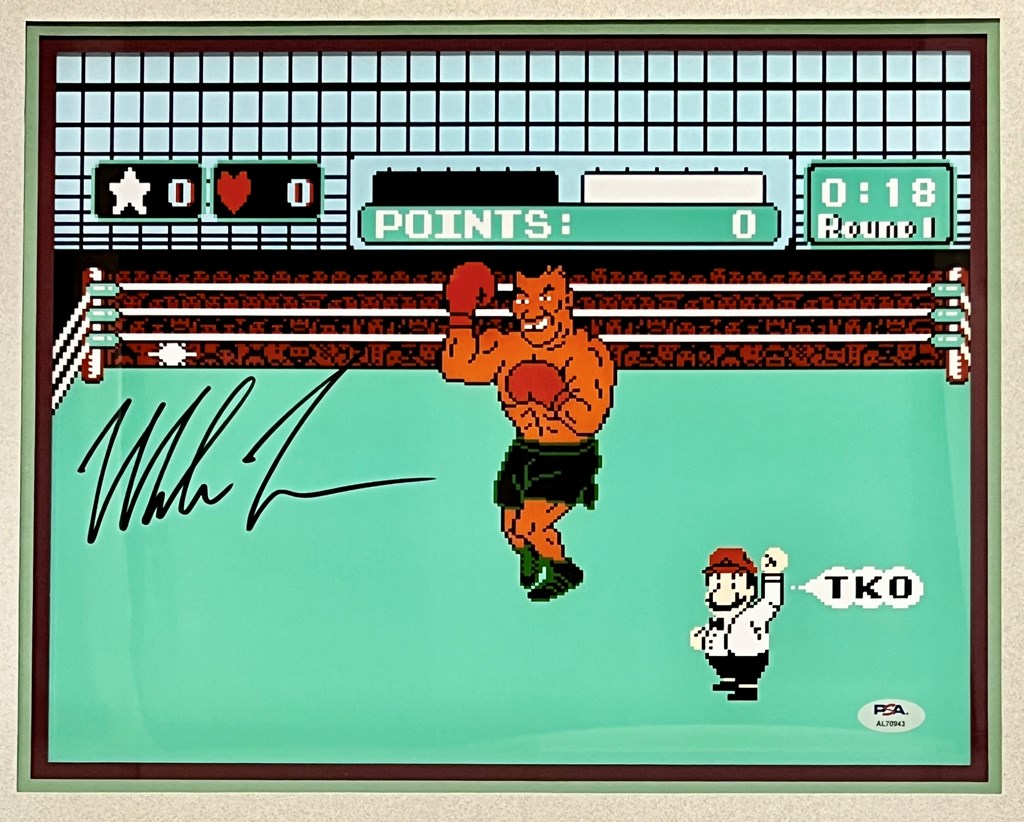 Mike Tyson Nintendo Punchout Signed Photograph by Mike Tyson Photograph Size 11" x 14" Custom Framed Size: 23" x 21" Comes with a Certificate of Authenticity From PSA Museum Quality Custom Framing Details: Custom framed in a 1" cherry frame. Triple matted with gray outer mat and maroon & teal inner matting. 100% acid free matting to museum standards. Enclosed in conservation clear glass 99% UV protection to keep the signature & art from fading. Dust covered backed, wired ready for hanging.