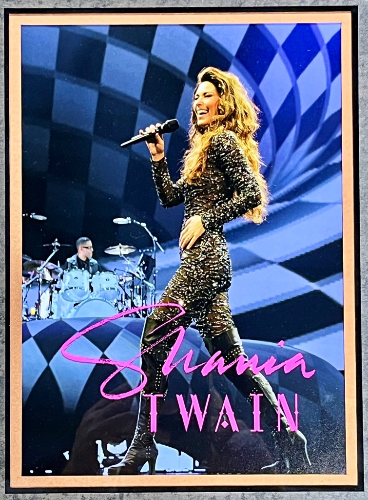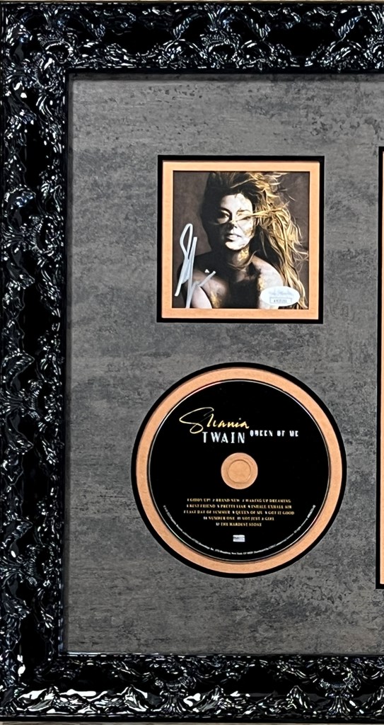 Shania Twain Signed CD Display Signed CD Cover by Shania Twain Custom Framed Size: 21" x 18" Comes with a Certificate of Authenticity From Long Island Silent Auction. Museum Quality Custom Framing Details: Custom framed in a 2" cherry frame. Double matted with blue suede outer mat and red inner matting. 100% acid free matting to museum standards. Enclosed in conservation clear glass 99% UV protection to keep the signature & art from fading. Dust covered backed, wired ready for hanging.