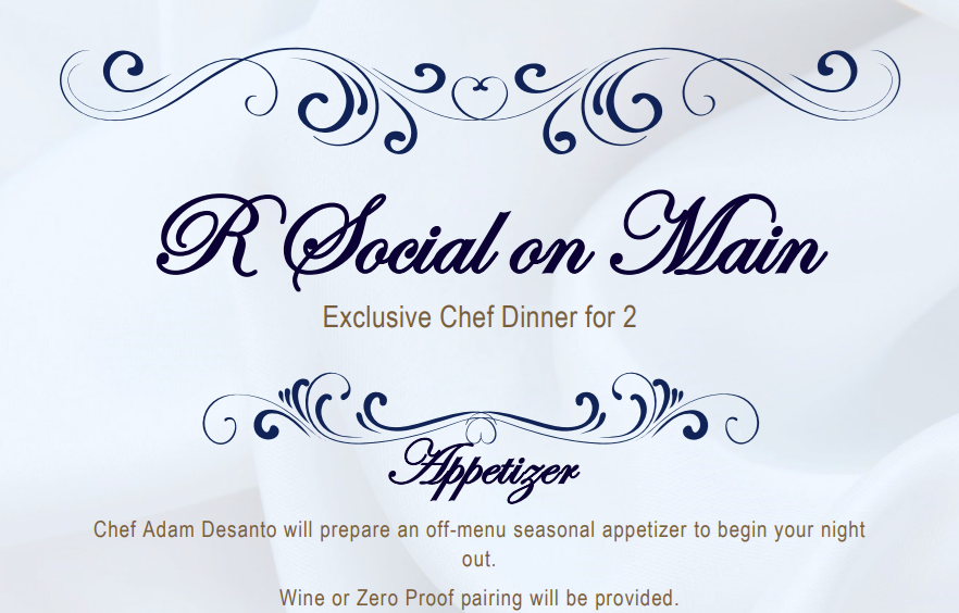 R Social on Main Exclusive Chef Dinner for 2 Appetizer Chef Adam Desanto will prepare an off-menu seasonal appetizer to begin your night out. Wine or Zero Proof pairing will be provided. Main course Email Info@rsocialonmain.com and we will provide you with options to best suit your dining experience. Please list any allegories or meal preferences. Dessert Seasonal dessert will be paired with a Craft Martini or Zero proof option. Thank you for bidding on this exclusive meal experience. Expiration 4/2026