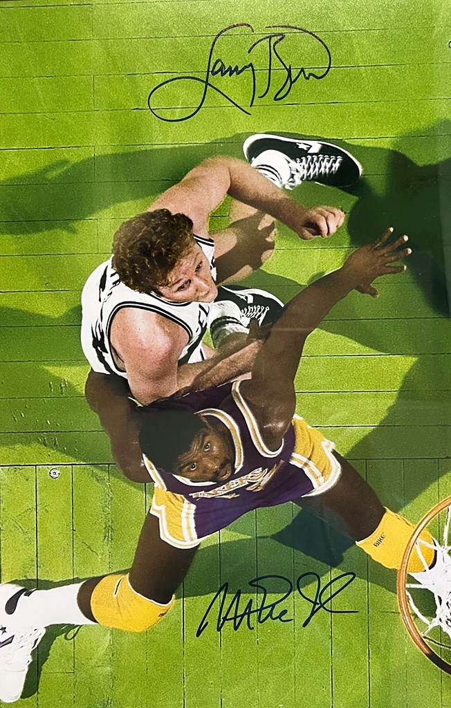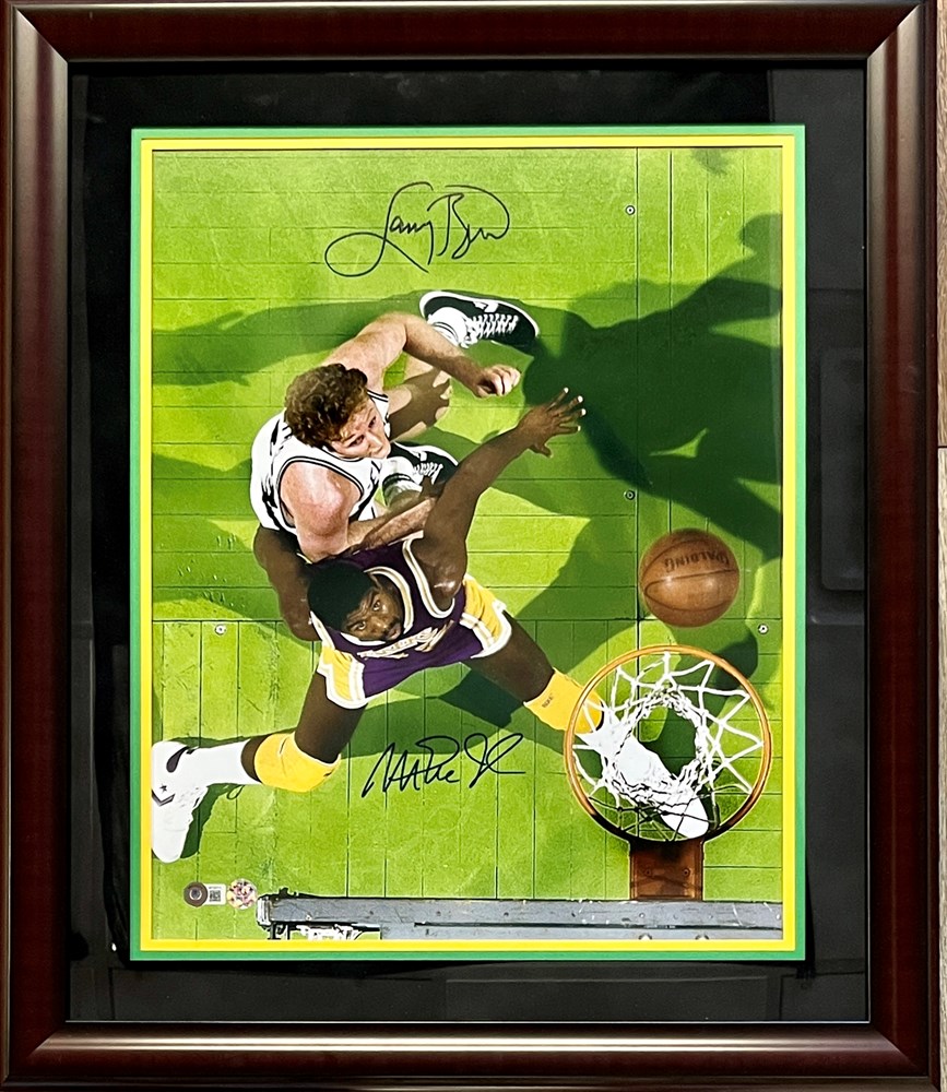 Larry Bird/Magic Johnson Signed Photograph by Larry Bird and Magic Johnson Photograph Size 16 x 20" Custom Framed Size: 26" x 20" Authenticated by Beckett Authentication. Museum Quality Custom Framing Details: Custom framed in a 2" cherry frame triple matted with black suede outer mat and yellow & green inner matting. 100% acid free matting to museum standards. Enclosed in conservation clear glass 99% UV protection to keep the signature & art from fading. Dust covered backed, wired ready for hanging.