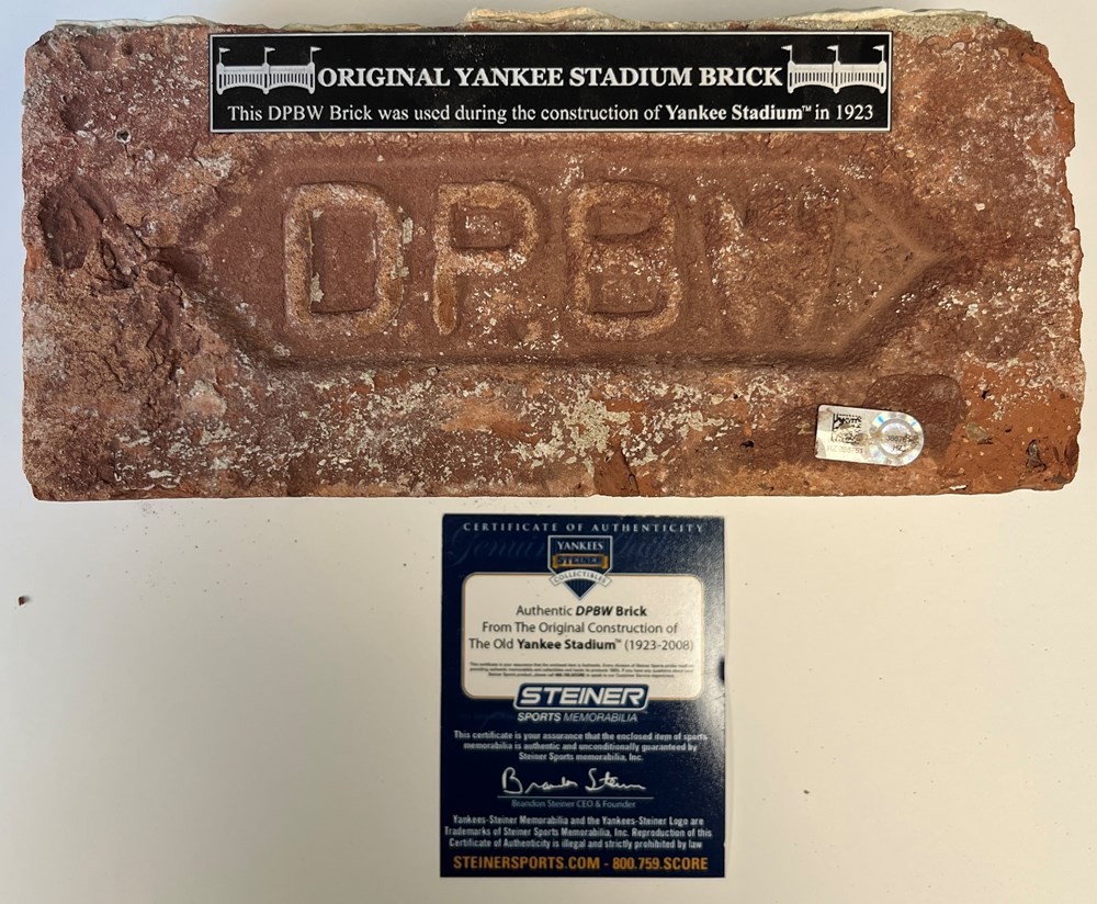 Original 1923 Yankee Stadium Brick Used in the original construction of the house that Ruth built-Yankee Stadium. Removed when to stadium was replaced in 2008. Very few of these survived intact. Authenticated by Major League Baseball and Steiner Sports.