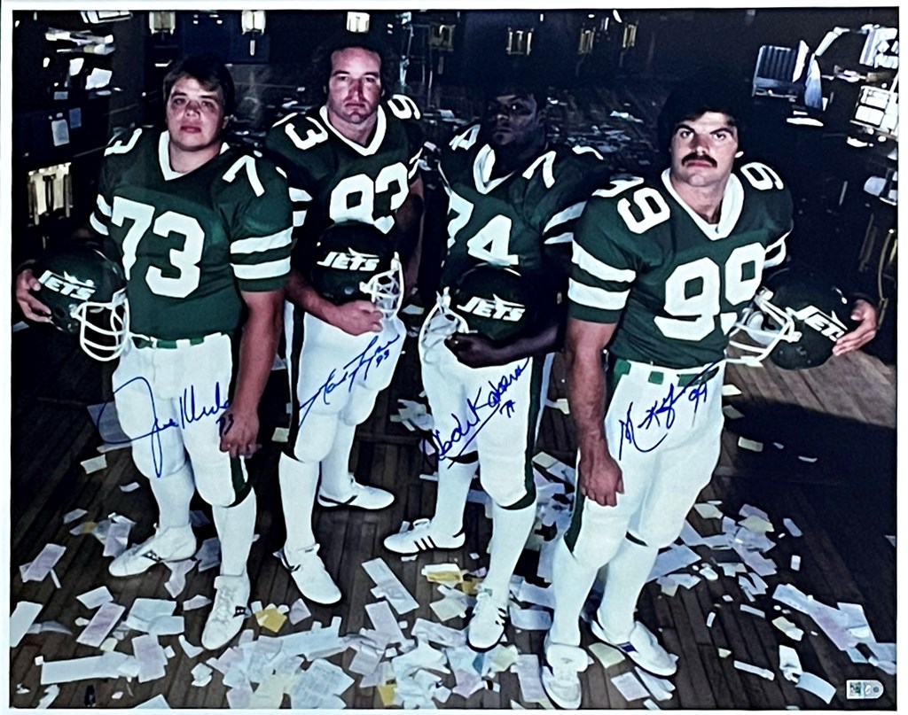Sack Exchange New York Jets Signed Photograph by Joe Klecko, Mark Gastineau, Marty Lyons, Abdul Salaam Photograph Size 16" x 20" Custom Framed Size: 22" x 26" Comes with a Certificate of Authenticity From AIV. Museum Quality Custom Framing Details: Custom framed in a 2" cherry frame. Double matted with green suede outer mat and white inner matting. 100% acid free matting to museum standards. Enclosed in conservation clear glass 99% UV protection to keep the signature & art from fading. Dust covered backed, wired ready for hanging.