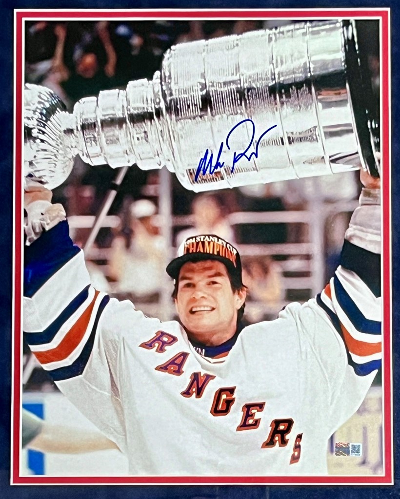 Mike Richter New York Rangers Autographed By Mike Richter Custom Framed Size: 21" x 18" Photograph Size 14" x 11" Comes with a Certificate of Authenticity From CX Collectibles (Steiner). Museum Quality Custom Framing Details: Custom Framed in a 2" cherry wood frame. Double matted with blue suede outer mat and red inner matting. 100% acid free matting to museum standards. Enclosed in conservation clear glass 99% UV protection to keep the signature & art from fading. Dust covered backed, wired ready for hanging