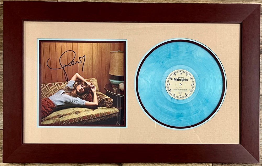 "Midnights" album signed perfectly by pop superstar Taylor Swift. This display features the Blue vinyl version of this album. Perfect for any Swifty. The signature is authenticated by JSA (James Spence Authentication)