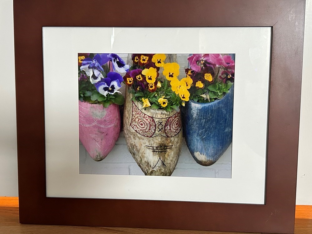 Stunning framed photo, "Pansies in Dutch Clogs", 16" x 14", taken by Sue Walker in Marken, The Netherlands. .