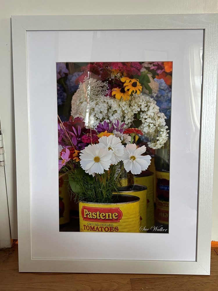Framed photo, "Flowers in a Pastene Tomato Sauce Can," 25" x 19"taken by Sue Walker in Martha’s Vineyard.