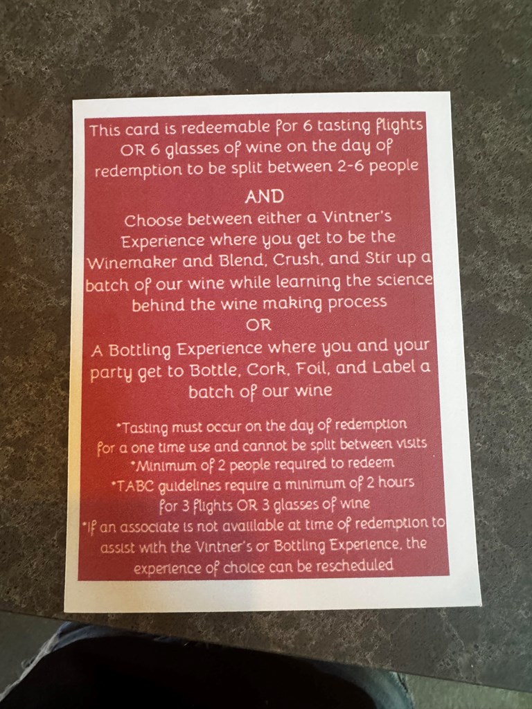 The winner of this package can redeem it for six tasting flights, OR six glasses of wine on the day of redemption to be split between 2–6 people. AND Choose between either a Vintner’s Experience where you get to be the Winemaker and Blend, Crush, and Stir up a batch of our wine while learning the science behind the wine making process -OR- A Bottling Experience where you and your party get to Bottle, Cork, Foil, and Label a batch of our wine * Tasting must occur on the day of redemption for a one time use and cannot be split between visits * Minimum of 2 people required to redeem * TABC guidelines require a minimum of 2 hours for 3 Flights OR 3 glasses of wine. * If an associate is not available at time of redemption to assist with the Vintner’s or Bottling Experience, the experience of choice can be rescheduled.