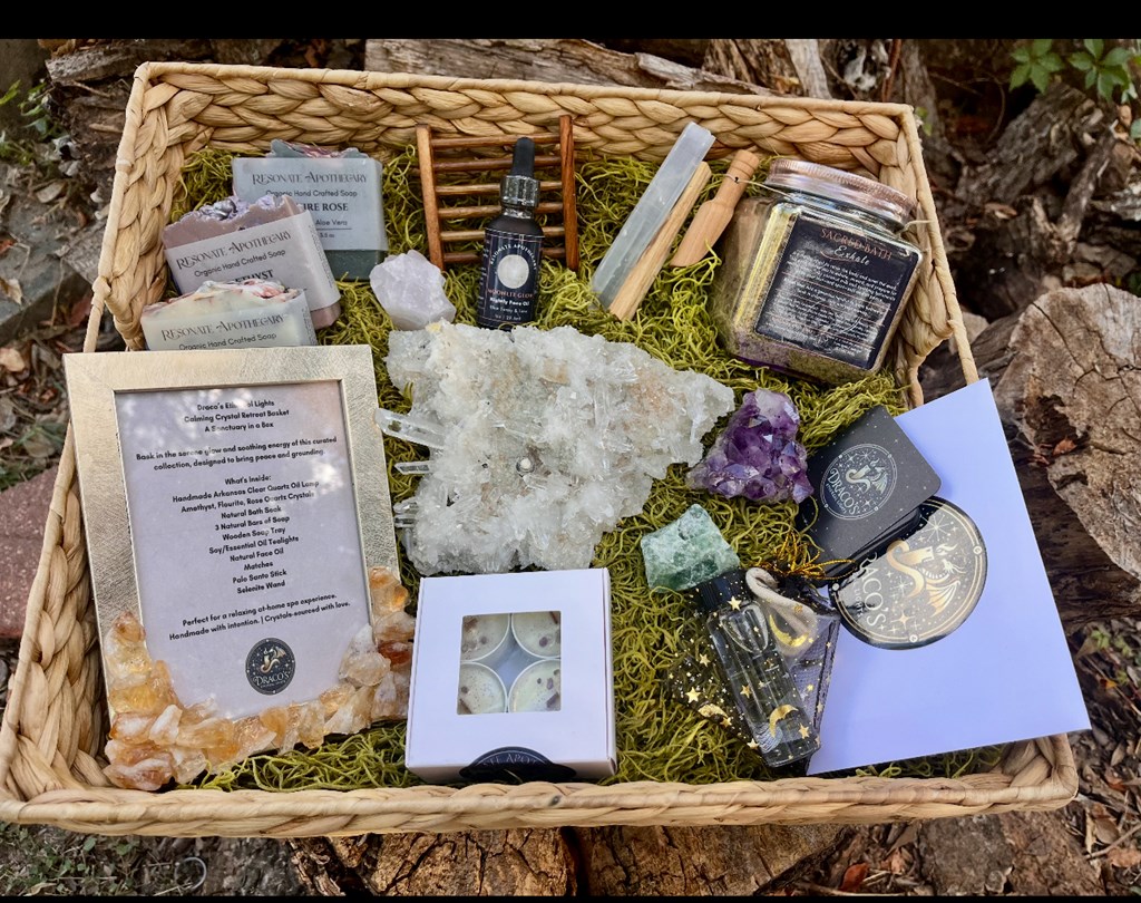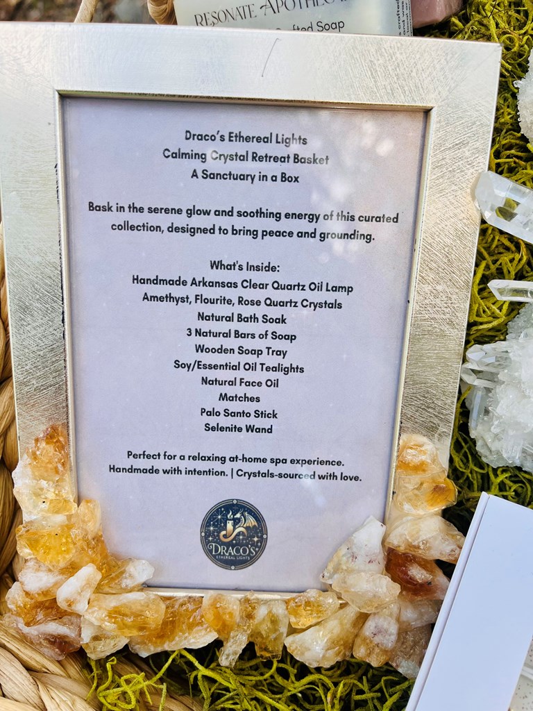 RETAIL VALUE: $400 Bask in the serene glow and soothing energy of this curated collection, designed to bring peace and grounding. What's Inside: Homemade Arkansas Clear Quartz Oil Lamp Amethyst, Flourite, Rose Quartz Crystals Nataral Bath Soak 3 Natural Bars of Soap Wooden Soap Tray Soy/Essential Oil Tealights Natural Face Oil Matches Palo Santo Stick Selenite Wand