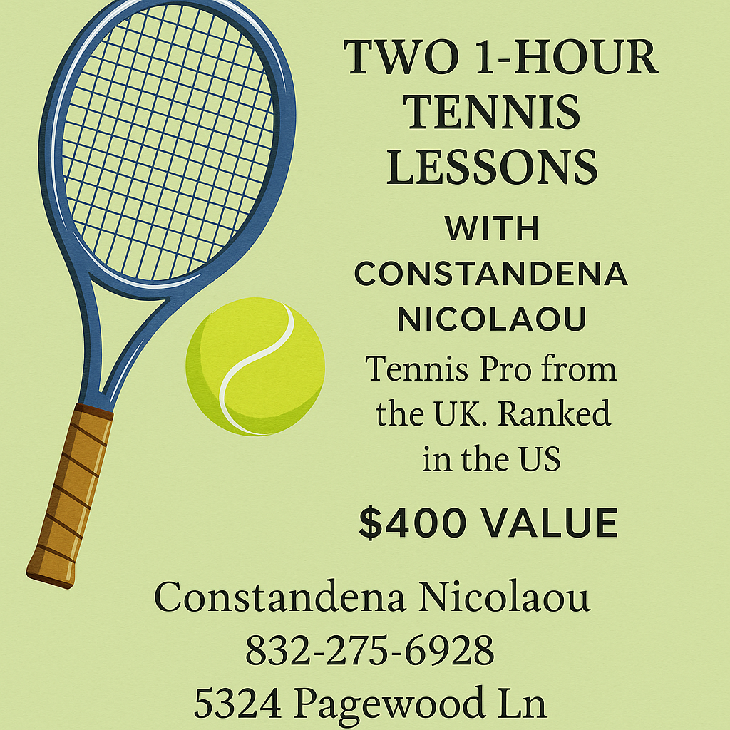RETAIL VALUE $400 2-1 Hour Tennis Lessons with Constandena Nicolaou Constandena (Dena) Nicolaou was born and raised in London, U.K. with Greek Cypriot roots. Her parents still live in London and her sister, brother-in-law, and two nieces live in Sydney, Australia. In 2017, she started her collegiate debut as an immediate starter on the tennis team at the University of Houston and by her sophomore year reached the Top 50 NCAA. Her senior year, she transferred to Sam Houston State University and after going 13-0, was awarded All-Conference Second Team Singles, and helped lead the team to the program’s first Division 1 Conference Championship. Unfortunately, she then had to retire for the rest of the season due to injury. After graduating in Kinesiology from Sam Houston State University, she stayed on as an Assistant Tennis Coach and a Graduate Assistant S&C Coach while completing her Master’s in Sports Management. Her main responsibilities included managing the tennis team’s health and wellness for practice and matches, strength & conditioning, gameday nutrition, and assisting the Head Coach with practice and match coaching, while also heavily involved with assisting strength & conditioning coaching with football, softball, volleyball, and soccer outside the tennis schedule. While a student-athlete at SHSU, she was plugged in with the Fellowship of Christian Athletes (FCA) which played a huge role in being part of a community that encouraged student-athletes to use their athletic platform to honor God. As a coach at SHSU, she developed into a Huddle Leader and served within the local community and FCA Camps. Her life verse is Proverbs 3:5-6, “Trust in the Lord with all your heart, and lean not on your own understanding; In all your ways acknowledge Him, and He shall direct your paths.” Her passion for coaching spans internationally as she invested in developing British juniors competing at the national and international level, collegiate tennis prospects and acting as a tournament travel coach to junior and professional tennis players. As of 2024, she had the competitive itch and picked up her racquets again to begin competing in professional tennis tournaments and desires to continue pursue her professional ranking outside of the academic and athletic schedule at Brook Hill. If she’s not on the tennis court or in the weight room, she can be found enjoying cooking (and eating!) Mediterranean food, finding a new trail with her dog, jet skiing in the summer, and watching classic rom-com movies in the winter. In her 2025 inaugural year as Head Coach, Coach Dena led the Brook Hill Tennis Program to unprecedented success, establishing a strong foundation for the future in the team’s first season competing in TAPPS Class 5A. The Guard and Lady Guard completed an undefeated spring season and concluded the season bringing home the Boys Team State Championship, Boys Doubles State Championship, and a Girls Doubles Third Place Finish. Coach Dena’s leadership, paired with the dedication of her athletes, has positioned Brook Hill Tennis as a rising powerhouse in TAPPS and laid the groundwork for continued success in the seasons to come.